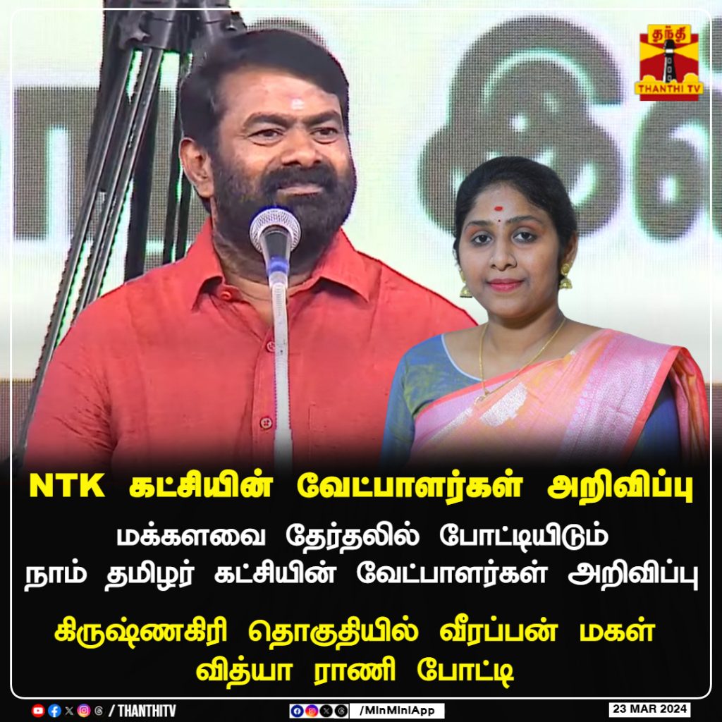 இந்நிலையில் நேற்று கிருஷ்ணகிரியில் வீரப்பன் மகள் வித்யாராணி போட்டியிடுகிறார் என்று சீமான் அறிவிப்பு செய்த போது விசில் சத்தத்துடன் அரங்கம் அதிர்ந்தது.