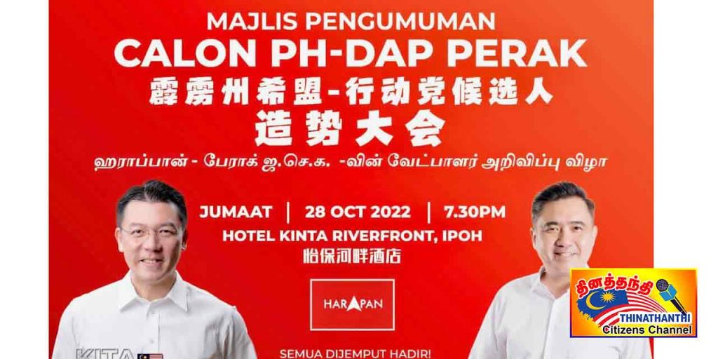அக்டோபர் 28 ஆம் தேதி இரவு 7.30 மணிக்கு ஈப்போ கிந்தா ரிவர் பிராண்ட் ஹோட்டலில் நடைபெறும் விழாவில் பேராக் ஜசெக வேட்பாளர்கள் பெயர் பட்டியலை ஜசெக தலைமை செயலாளர் அந்தோணி லோக் அறிவிக்கிறார்