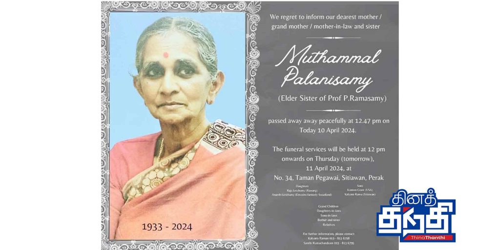 பேராசிரியர் இராமசாமியின் மூத்த சகோதரி திருமதி முத்தம்மாள் பழனிசாமி நேற்று பேராக் மாநிலம் சிதியவானில் உள்ள அவரது இல்லத்தில் காலமானார்.