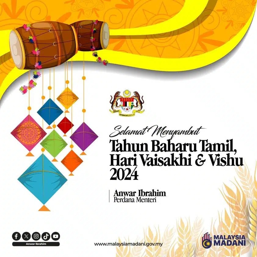 கோலாலம்பூர், ஏப்ரல் 13: சித்திரை தமிழ்ப் புத்தாண்டு, வைசாகி விஷு பண்டிகையைக் கொண்டாடி மகிழும் தமிழ், சீக்கியர் மற்றும் மலையாளி சமூகத்தினருக்கு பிரதமர் டத்தோஸ்ரீ அன்வார் இப்ராகிம் தமது வாழ்த்துகளைத் தெரிவித்துக் கொண்டார்.