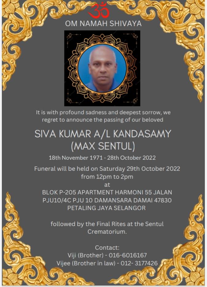 செந்தூல் வட்டாரத்தைச் சேர்ந்த செந்தூர் விஜியின் சகோதரர் சிவகுமார் என்ற மெக்ஸ் காலமானார்.