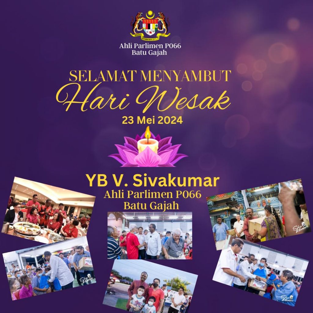 இன்று கொண்டாடப்படும் விசாக தினத்தில், அனைத்து புத்த சமயத்தினருக்கும் விசாக தின வாழ்த்துகளைத் தெரிவித்துக் கொள்கிறேன் என்று பத்து காஜா நாடாளுமன்ற உறுப்பினர் மற்றும் முன்னாள் மனிதவள அமைச்சர் வ சிவகுமார் தமது வாழத்து செய்தியில் குறிப்பிட்டுள்ளார்.