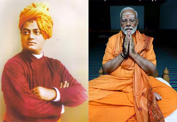 அவரது இயற்பெயர் நரேந்திரநாத் தத்தா. இன்று அதே பாறையில் 132 ஆண்டுகளுக்கு பிறகு நரேந்திர தாமோதர தாஸ் என்ற பெயரை தாங்கியுள்ள பிரதமர் நரேந்திர மோடி தியானம் இருப்பது வியப்பை ஏற்படுத்தி உள்ளது.