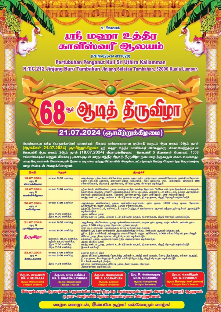 ஜிஞ்சாங் செலாத்தான் ஸ்ரீ மகா காளியம்மன் ஆலயத்தில் நாளை ஞாயிற்றுக்கிழமை 21 ஆம் தேதி 68 ஆம் ஆண்டு ஆடித் திருவிழா மிகவும் விமரிசையாக நடைபெறுகிறது.