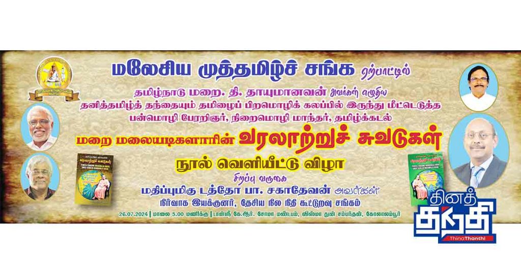 மறை மலையடிகளாரின் வரலாற்று சுவடுகள் நூல் வெளியீட்டு விழா வரும் ஜூலை 26 ஆம் தேதி மாலை 5 மணிக்கு டான்ஸ்ரீ சோமா அரங்கில் நடைபெறுகிறது.