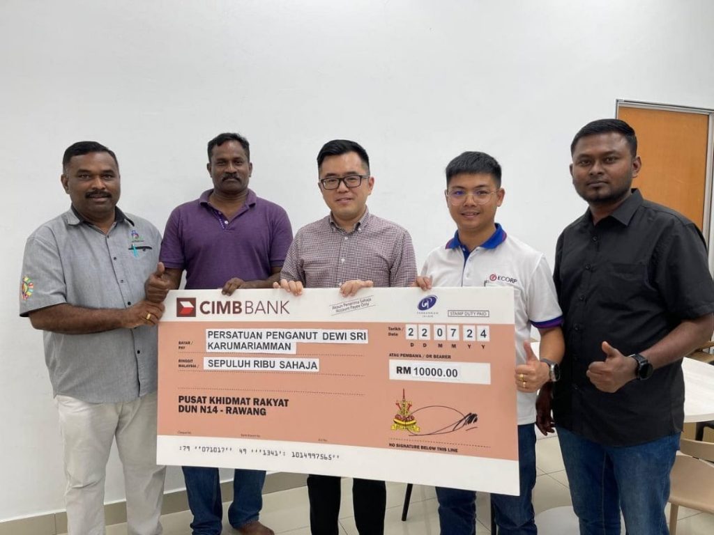 இம்மானியத்திற்கான மாதிரி காசோலையை ரவாங் சட்டமன்ற உறுப்பினர் சுவா வேய் கியாட் கோவிலின் நிர்வாக உறுப்பினர்களிடம் ஒப்படைத்தார்.