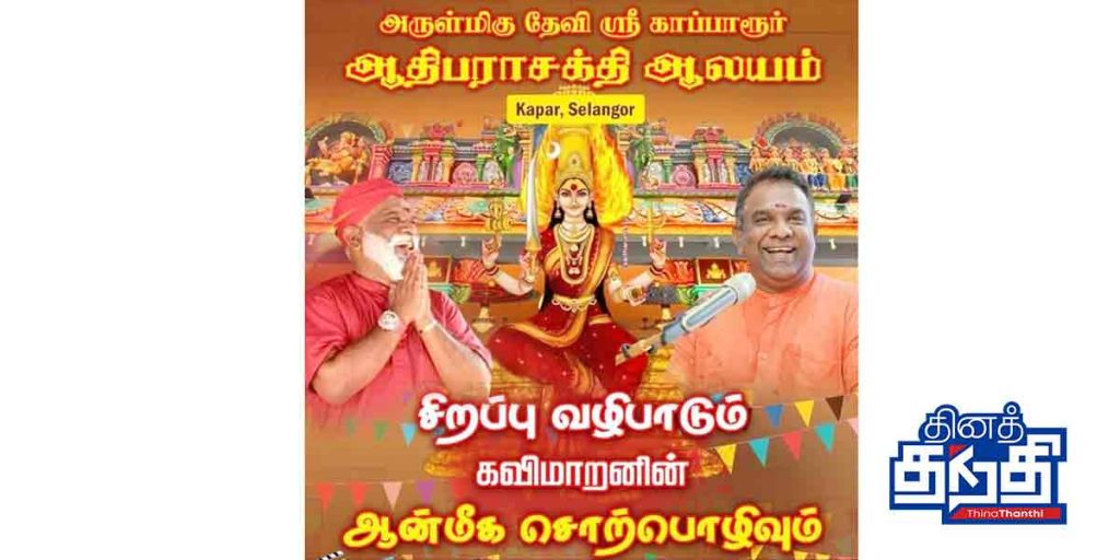 வரும் செப்டம்பர் ஒன்றாம் தேதி ஞாயிற்றுக்கிழமை மாலை 7 31 க்கு காப்பாரில் வீற்றிருக்கும் காப்பாரூர் அருள்மிகு ஸ்ரீ ஆதிபராசக்தி ஆலயத்தில் சிறப்பு பூஜையோடு கவிமாறனின் சமய சொற்பொழிவும் நடைபெறுவதால் சுற்றுவட்டார பொதுமக்கள் குடும்பத்தோடு கலந்து கொண்டு நம் சமயத்தை பற்றிய தெளிவை இதன் வழி பெற்றுக் கொள்ள அன்புடன் அழைக்கப்படுகிறீர்கள் மறவாமல் அனைவரும் வாருங்கள்.
