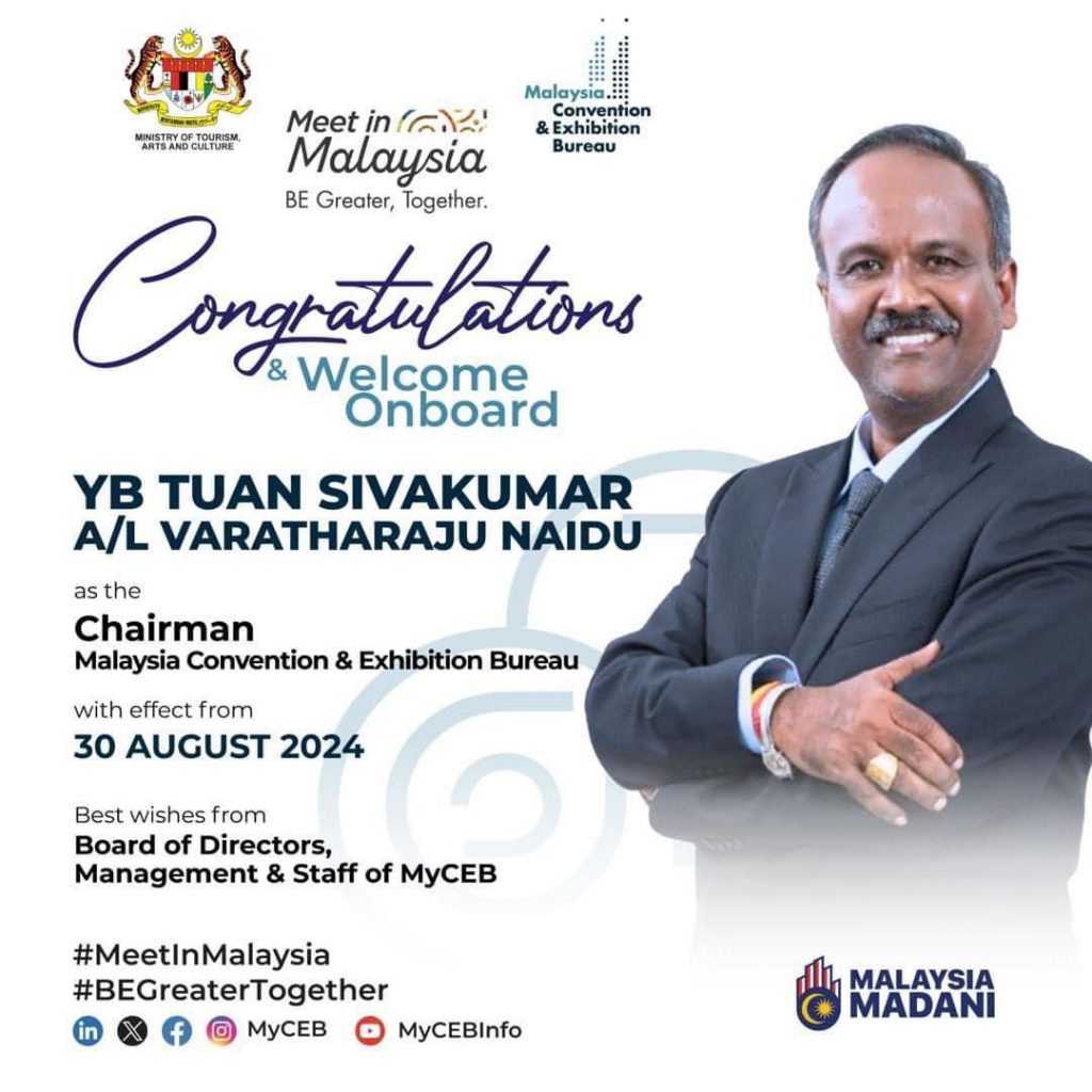 30 ஆகஸ்ட் 2024 முதல் மலேசிய மாநாட்டு மற்றும் கண்காட்சி பணியகத்தின் (MyCEB) தலைவராக எனது நியமனம் நடப்புக்கு வருகிறது.