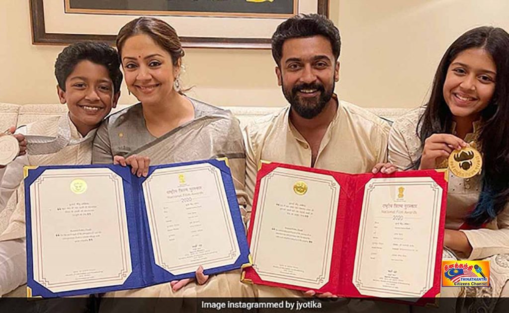 இதில் சிறந்த நடிகருக்கான விருதை சூர்யாவும் சிறந்த திரைப்படத்திற்கான விருதை ஜோதிகாவும் பெற்றுக் கொண்டனர்.