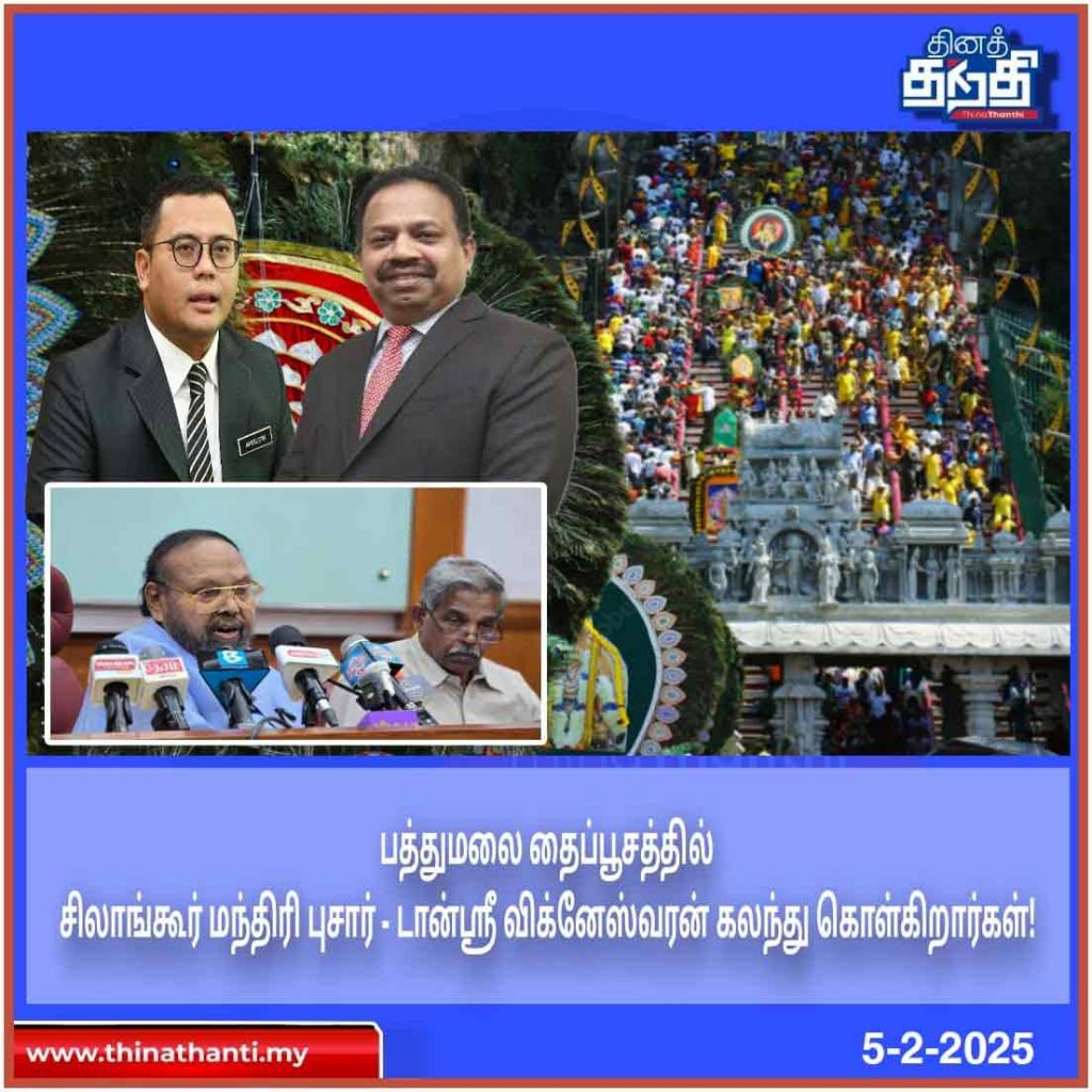 இவ்வாண்டு பத்துமலை தைப்பூசத்தில் அதாவது பிப்ரவரி 11 ஆம் தேதி காலை பத்து மணிக்கு பத்துமலை தைப்பூச விழாவில் சிலாங்கூர் மாநில மந்திரி பெசார் டத்தோஸ்ரீ அமிரூடின் சாரி, ம இகா தேசிய தலைவர் டான்ஸ்ரீ எஸ்.ஏ.விக்னேஸ்வரன் ஆகியோர் முக்கிய பிரமுகர்களாக கலந்து கொள்கிறார்கள்.