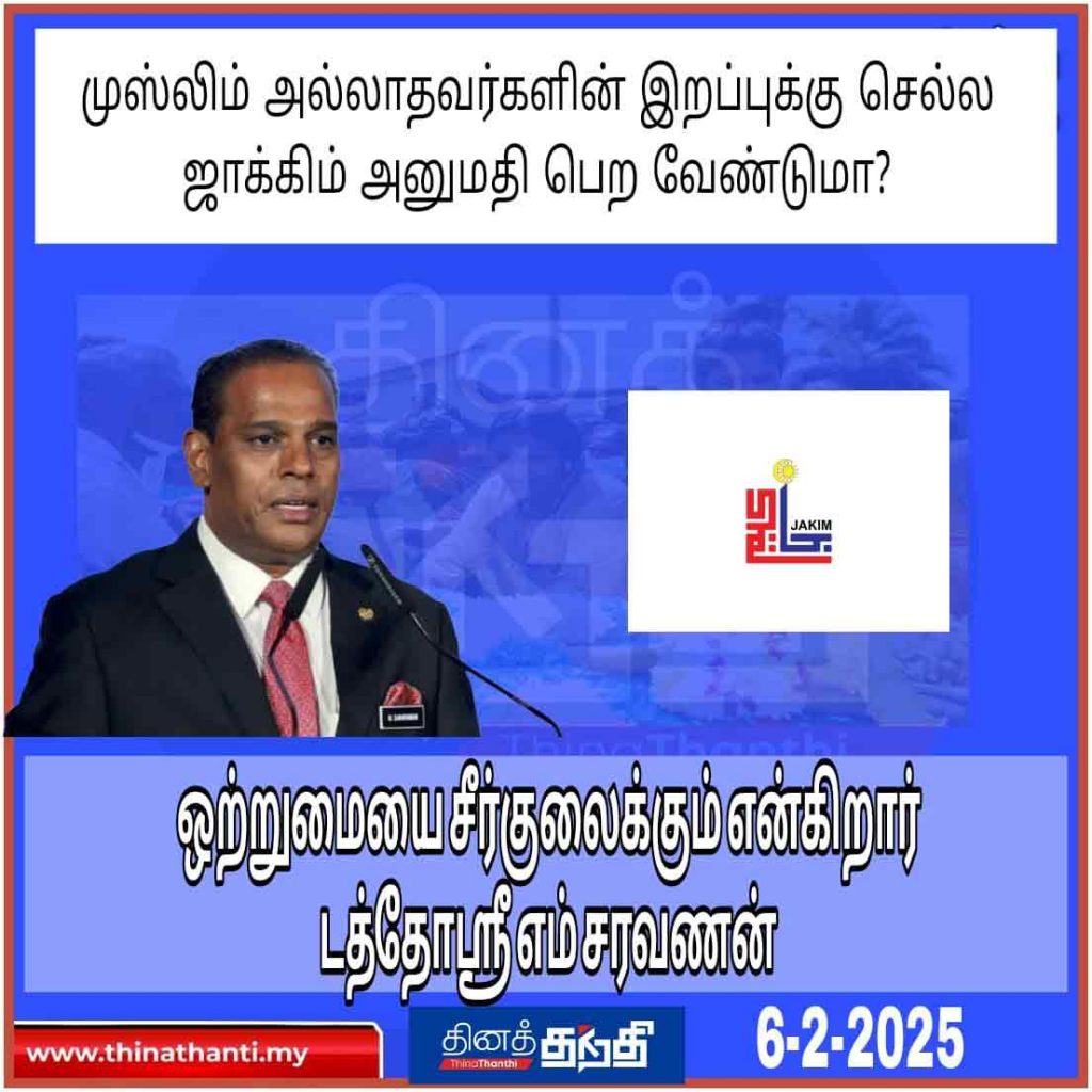 முஸ்லிம் அல்லாத நண்பர்களின் இறப்புக்கு செல்ல ஜாக்கிமின் அனுமதி பெற வேண்டும் என்ற விதி மலேசியர்களின் ஒற்றுமையை சீர்குலைக்கும் என்று ம இகா தேசிய துணை தலைவர் டத்தோஸ்ரீ எம் சரவணன் குறிப்பிட்டுள்ளார்.