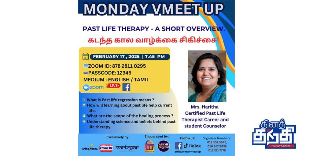 இந்த வாரத்தில் கடந்த கால வாழ்க்கை சிகிச்சை (முன் ஜென்ம தெரபி) குறித்து ஆலோசகர்கள் சான்றளிக்கப்பட்ட கடந்த கால வாழ்க்கை சிகிச்சையாளர் தொழில் மற்றும் மாணவர் ஆலோசகர் திருமதி ஹரிதா அவர்கள் பேசவிருக்கிறார்.
