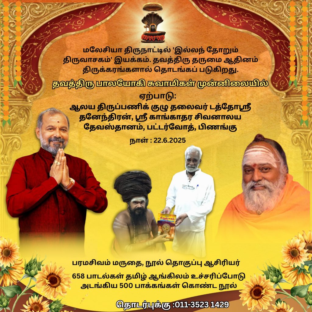 மலேசியத் திருநாட்டில் பட்டர்வெர்த் நகரில் அமையவிருக்கும் மிகப் பெரிய சிவனாலயமான ஸ்ரீ கெங்காதர சிவபெருமான் தேவஸ்தான அடிக்கல் நாட்டும் விழாவிக்கு வருகைதரும் தவத்திரு தருமை ஆதீனம் “இல்லந் தோறும் திருவாசகம்” இயக்கத்தினை தொடக்கி வைத்து ஆசீர்வதிப்பார்கள்.