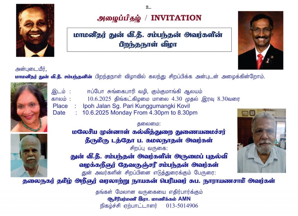 மண்ணில் மறைந்தாலும் மக்கள் மனங்களில் இன்னமும் வாழ்ந்து கொண்டிருக்கும் துன் சம்பந்தன் நினைவுக்கூறலுக்கு முன்னாள் கல்வி துணை அமைச்சர் டத்தோ ப.கமலநாதன் தலைமையேற்க்கும் வேளையில் துன் சம்பந்தனின் மகள் வழக்கறிஞர் தேவகுஞ்சரியும் கலந்து கொள்ளும் அதேவேளையில் துன் சம்பந்தனின் சிறப்பினை எடுத்துரைக்க வருகிறார் தமிழ் அறிஞர் சுப. நாராயணசாமி அவர்கள்.