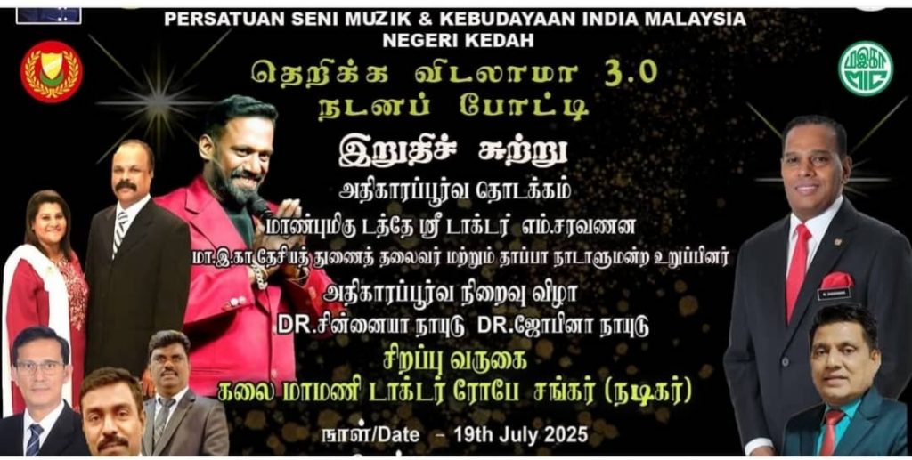 நாடறிந்த கலைஞர் எம்.ஜே.தேவா தாயாரிப்பில் 19.7.2025 சனிக்கிழமை காலை மணி 11.00 முதல் மாலை மணி 7,00 வரை தெறிக்க விடலாம எனும் மாபெரும் நடனப்போட்டி சுங்கைபட்டாணி விலேஜ் மோல் அரங்கில் நடைபெற உள்ளது.
