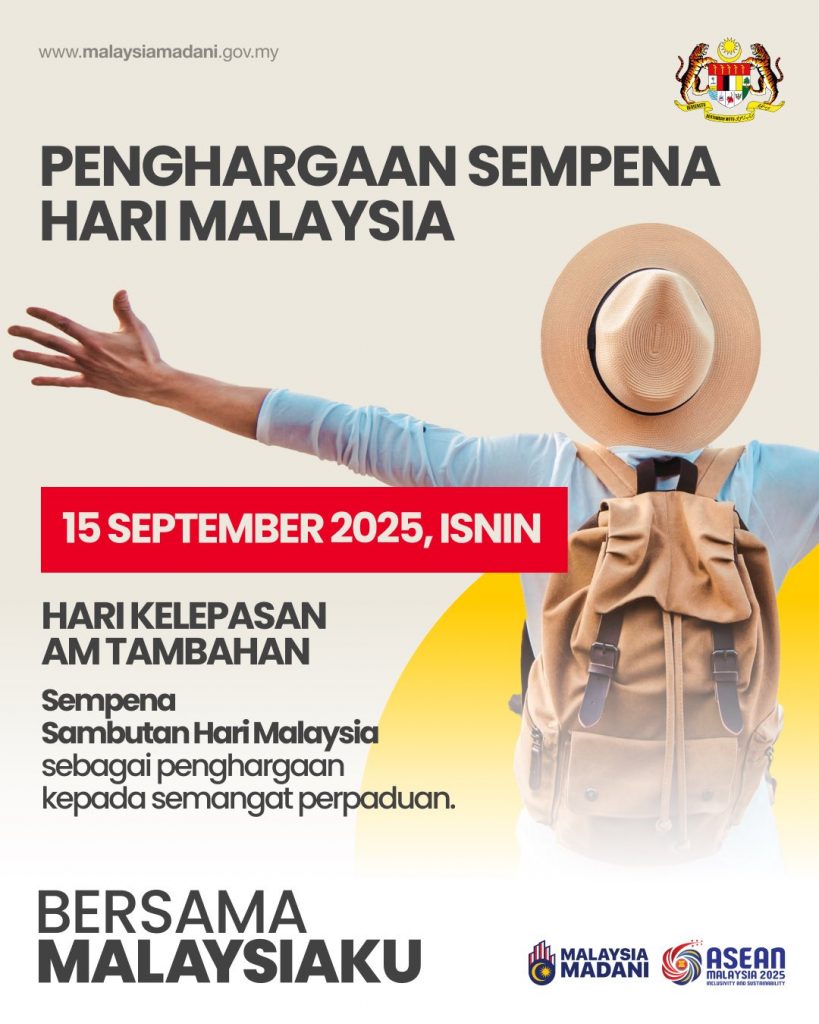 செப்டம்பர் 16 ஆம் தேதி மலேசியத் தினத்தை முன்னிட்டு அதற்கு முதல் நாள் செப்டம்பர் 15ஆம் தேதி சிறப்பு விடுமுறை அளிக்கப்படுகிறது என்று பிரதமர் டத்தோஸ்ரீ அன்வார் இப்ராஹிம் இன்று அறிவித்தார்.