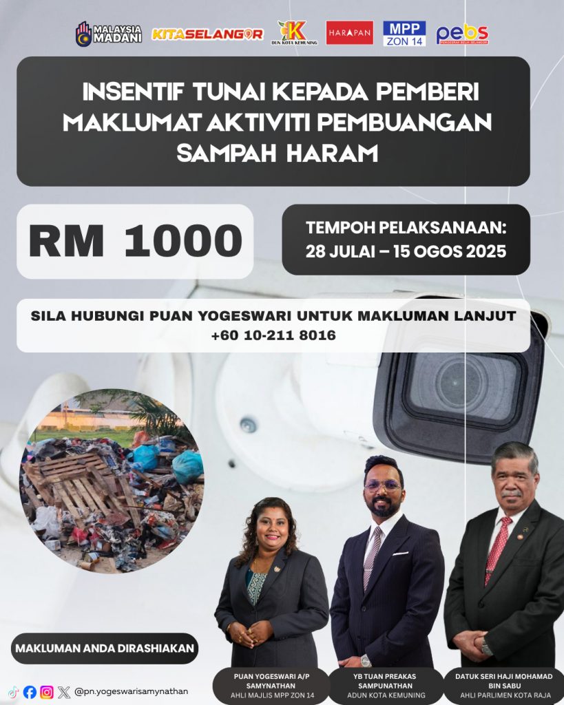 சட்டவிரோதமாக குப்பைகளை வீசுவோரை சட்டத்தின் பிடியில் நிறுத்தி அவர்களுக்கு தகுந்த தண்டனை கிடைப்பதற்கு ஏதுவாக தேவையான ஆதாரங்களை வழங்குவோர் இந்த 1,000 வெள்ளி வெகுமதிக்கு தகுதியானர்கள் என்று அவர் தெரிவித்தார்.