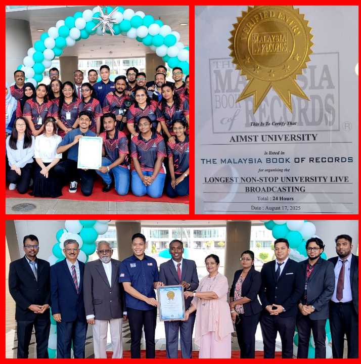 மலேசிய சாதனை புத்தக அதிகாரிகள் இந்த நிகழ்வை நேரிடையாக கண்காணித்து, அதன் சாதனையை உறுதிப்படுத்தினர்.“இது ஏய்ம்ஸ்ட் பல்கலைக்கழகத்திற்கான வரலாற்று சிறப்புமிக்க தருணம். ‘24 மணி நேர சிறப்புகள்’ நிகழ்ச்சி எங்கள் சாதனைகளை மட்டுமல்லாது, மாணவர்கள் மற்றும்
