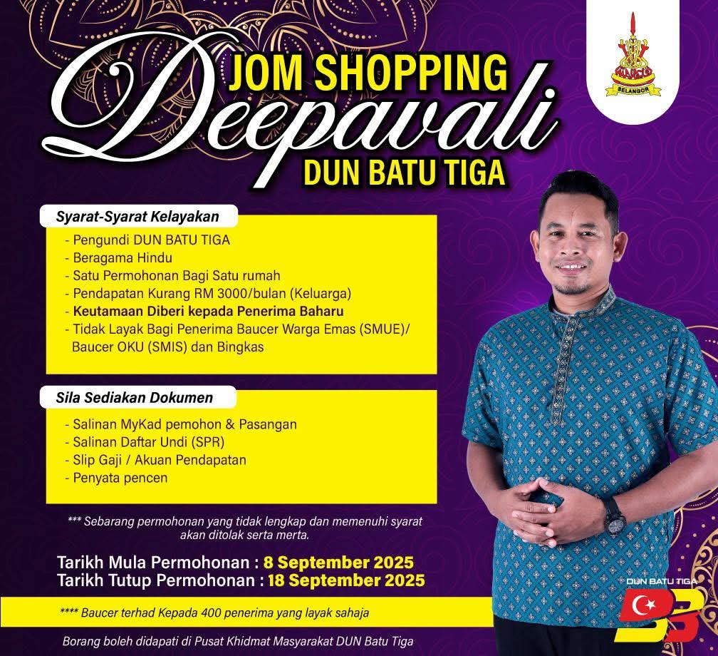 ஷா ஆலம், செப்.8 – எதிர்வரும் அக்டோபர் மாதம் 20ஆம் தேதி கொண்டாடப்படவிருக்கும் தீபாவளிப் பண்டிகையை முன்னிட்டு தகுதி உள்ள குடும்பங்களுக்கு இலவச தீபாவளி பற்றுச் சீட்டுகளை விநியோகிக்கும் பணியை அனைத்து சட்டமன்றத் தொகுதிகளும் தொடங்கியுள்ளன.