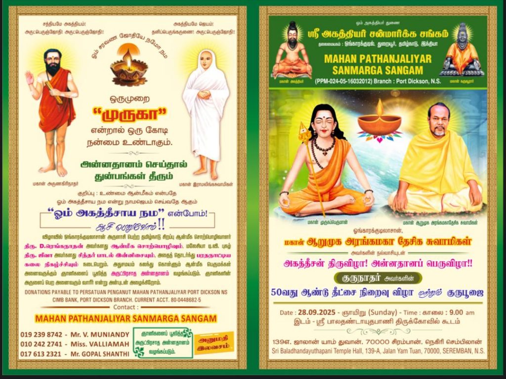 இதனை முன்னிட்டு 28-9-2025 ஆம் தேதி ஞாயிற்றுக்கிழமை காலை 9.00 மணியளவில் சிரம்பான் ஜாலான் யாம் துவான் ஸ்ரீ பால தண்டாயுதபாணி திருக்கோவில் கூடத்தில் ஓங்காரக் குடிலாசான் மகான் ஆறுமுக அரங்கமகா தேசிக சுவாமிகளின் 50 ஆம் ஆண்டு தீட்சை நிறைவு விழாவும் குரு பூஜையும் மகான் பதஞ்சலி யார் சன்மார்க்க சங்கம் போர்ட் டிக்சன் கிளை (மலேசியா) நடைபெறுகிறது.