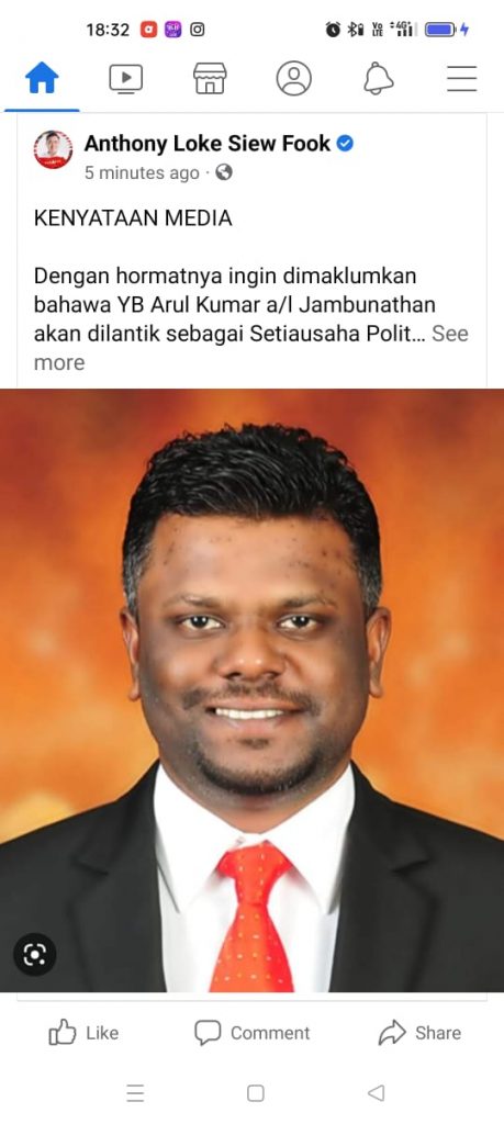 போக்குவரத்து அமைச்சர் அந்தோணி லோக்கின் அரசியல் செயலாளராக நெகிரி செம்பிலான் மாநில ஆட்சிக்குழு உறுப்பினர் ஜெ.அருள்குமார் நியமிக்கப்பட்டுள்ளார்.