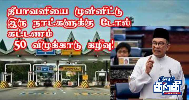 இந்த தருணத்தில் தீபாவளிக்கு இரண்டு நாட்களுக்கு டோல் கட்டணம் 50 விழுக்காடு குறைக்கப்படும் என்று பிரதமர் டத்தோஸ்ரீ அன்வார் இப்ராஹிம் இன்று அறிவித்தார்.