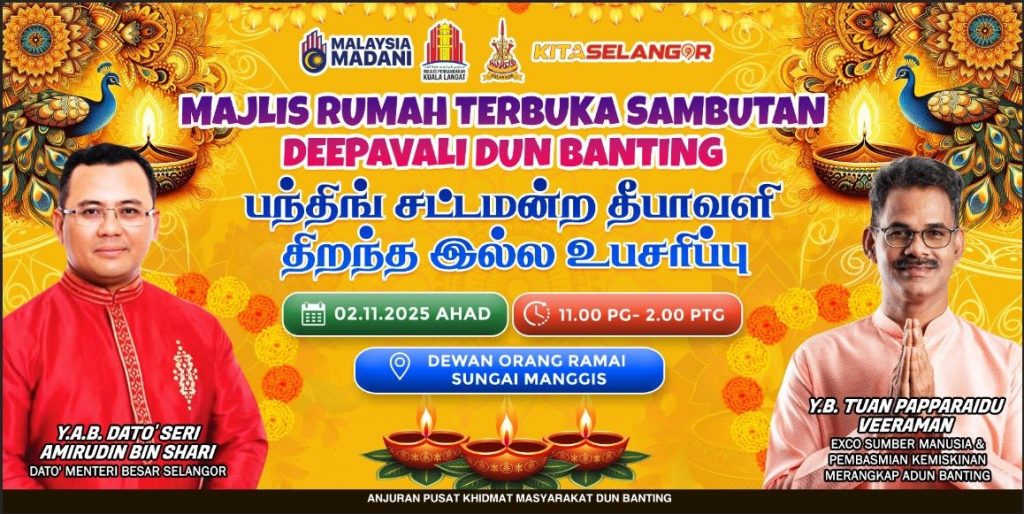 பந்திங், அக் 31: பந்திங் சட்டமன்ற உறுப்பினர் மற்றும் மனிதவள மற்றும் வறுமை ஒழிப்பு ஆட்சிக்குழு உறுப்பினர் மாண்புமிகு பாப்பாராய்டு வீரமான் அவர்களுடன் இணைந்து தீபாவளிப் பண்டிகையைக் கொண்டாட, பந்திங் சட்டமன்றத் தொகுதி மக்களின் திறந்த இல்ல உபசரிப்புக்கு அனைவரும் அன்புடன் அழைக்கப்படுகின்றனர்.