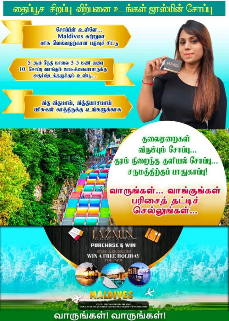 தலைமுறைகள் விரும்பும் நறுமணம் மற்றும் தரம் நிறைந்த சோப் அதுவும் தைபூசத்தை முன்னிட்டு சிறப்பு விலை விற்பனையில் பல பரசுகளுடன் ஜாஸ்மின் நிறுவனம் ஏற்பாடு செய்துள்ளது.