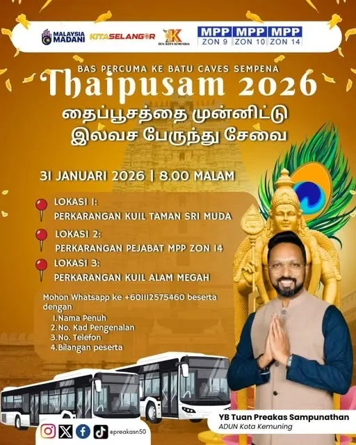 கோத்தா கெமுனிங் தொகுதி மக்கள் கூட்ட நெரிசலைத் தவிர்த்து, பாதுகாப்பான முறையில் பத்துமலைக்குச் சென்று வழிபாடுகளை மேற்கொள்ள இந்த நல்வாய்ப்பைப் பயன்படுத்திக் கொள்ளுமாறு மாண்புமிகு பிரகாஷ் சம்புநாதன் அழைப்பு விடுத்துள்ளார்.