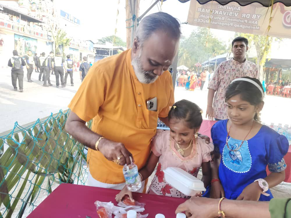 பக்தர்கள் தாகம் தீர்க்க குளிர்பானங்கள் மற்றும் சுவையான உணவுகளை பத்து காஜா நாடாளுமன்ற உறுப்பினர் டாக்டர் சிவகுமார் வழங்கி உபசரித்தார்.