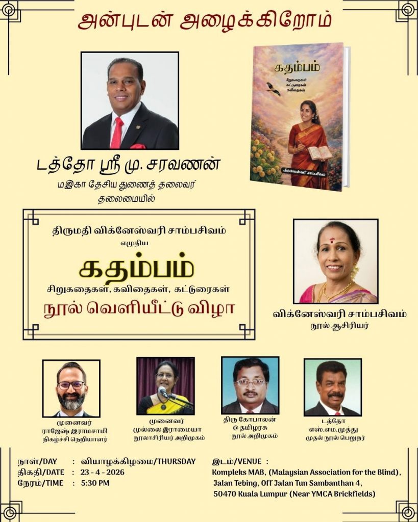 எதிர்வரும் வியாழக்கிழமை 23 ஏப்ரல் 2026-ஆம் நாள் மாலை 5.30 மணி தொடங்கி தேநீர் விருந்துபசரிப்புடன் இந்த நூல் வெளியீட்டு விழா, பிரிக்பீல்ட்ஸ் மலேசிய கண்பார்வையற்றோர் சங்க மண்டபத்தில் (Jalan Tebing, Off Jalan Tun Sambanthan 4, Brickfields, 50470 Kuala Lumpur) நடைபெறுகிறது.