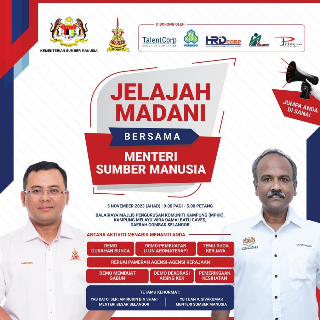 மனிதவள அமைச்சின் ஏற்பாட்டில் வரும் நவம்பர் 5 ஆம் ஞாயிற்றுக்கிழமை Balairaya Pengurusan Komunity Kampung (MPKK) Kampung Melayu Wira Damai Batu Caves, Daerah Gombak Selangor என்ற இடத்தில் காலை 9.00 மணி முதல் மாலை 5.00 மணி வரை ஜெலாஜா மடானி நிகழ்வு மிகப்பெரிய அளவில் நடைபெறுகிறது.