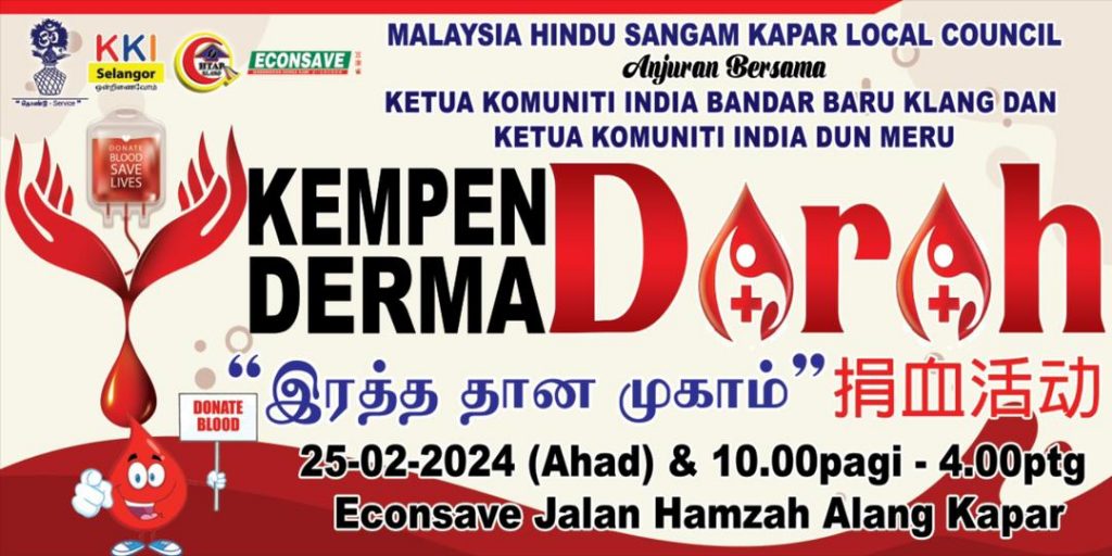 மலேசிய இந்து சங்கம் காப்பார் பேரவை, காப்பார் மற்றும் மேரு வட்டார இந்திய கிராம தலைவர்கள் ஏற்பாட்டில் சுவாமி விவேகானந்தர் அவர்களின் 161 ஆம் ஆண்டு பிறந்தநாள் முன்னிட்டு கிள்ளான் மருத்துவமனை ஆதரவில் இரத்த தானம் ஏற்பாடு செய்யப்பட்டுள்ளது.