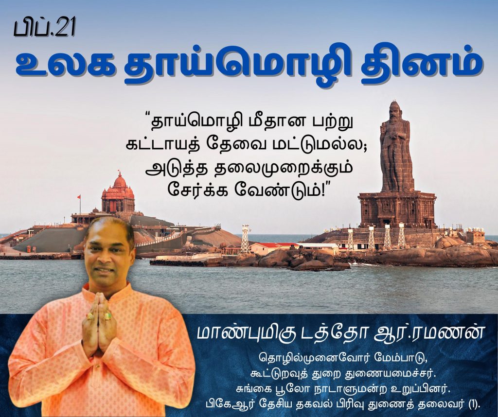 இன்று உலக தாய்மொழி தினத்தைஅனுசரிக்கும் தமிழ் மொழிப் பற்றாளர்கள், தமிழ்ச் சான்றோர்கள், தமிழாரிசியர் பெருமக்கள், தமிழ் ஊடகவியலாளர்கள் உட்பட தமிழ் மக்கள் அனைவருக்கும், தொழில்முனைவோர் மேம்பாடு கூட்டுறவு துறை துணையமைச்சர் டத்தோ ரமணன் ராமகிருஷ்ணன் நல்வாழ்த்துகளை தெரிவித்துக் கொண்டார்.